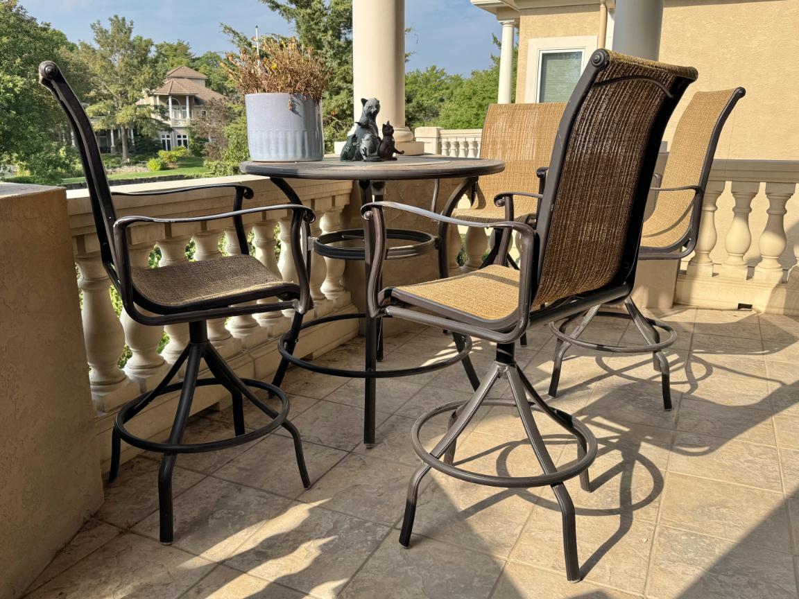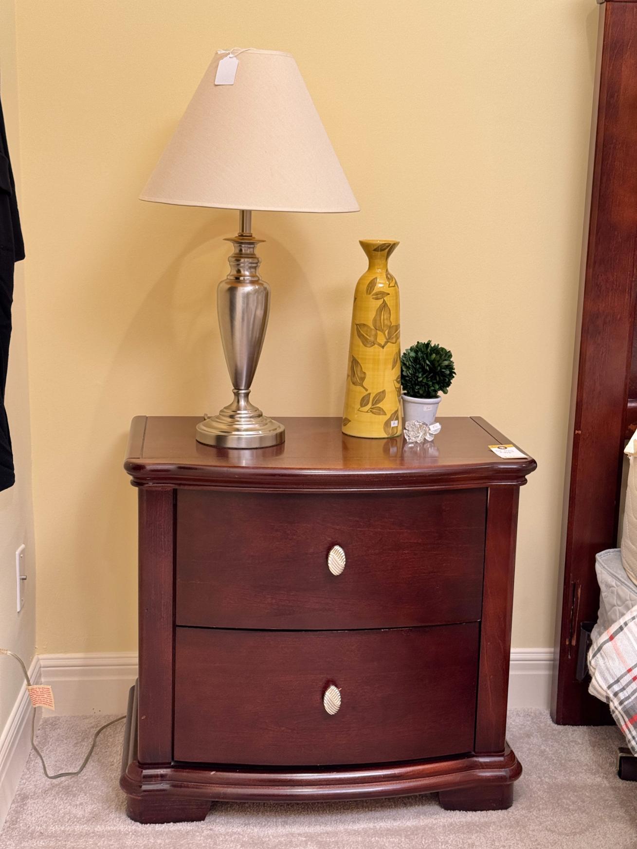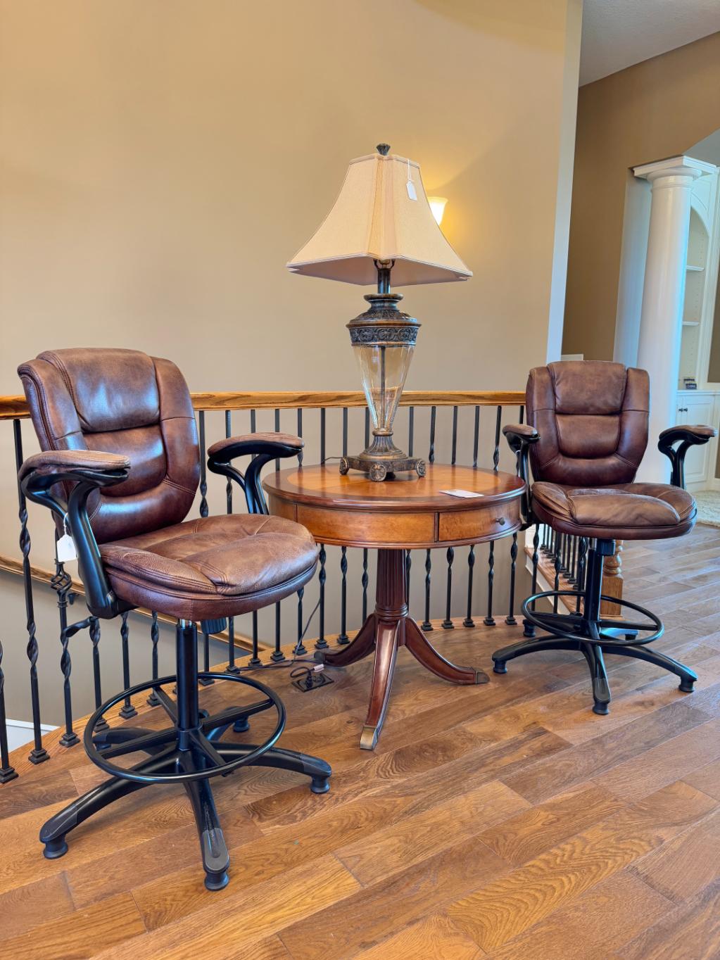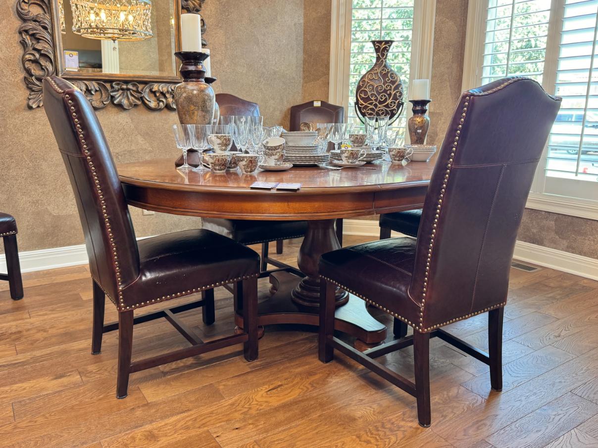 King Size Bed with Mattress and Box Spring, Set of Four Swivel Barstools, Woodmark Curved Sofa in Tan Upholstery, Oval Extension Dining Table, Demilune Curio Cabinet with Bubble Glass Window Panes, Powered Recliner, Powell Mahogany Curved Marble Top Cabinet, Vanity Dresser with Mirror, Signature Design by Ashely Furniture Two-Tone Nightstand with Charging Ports,
