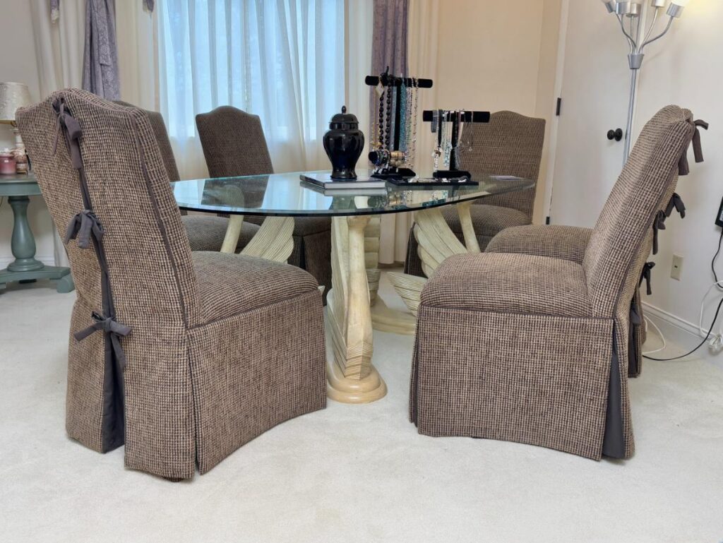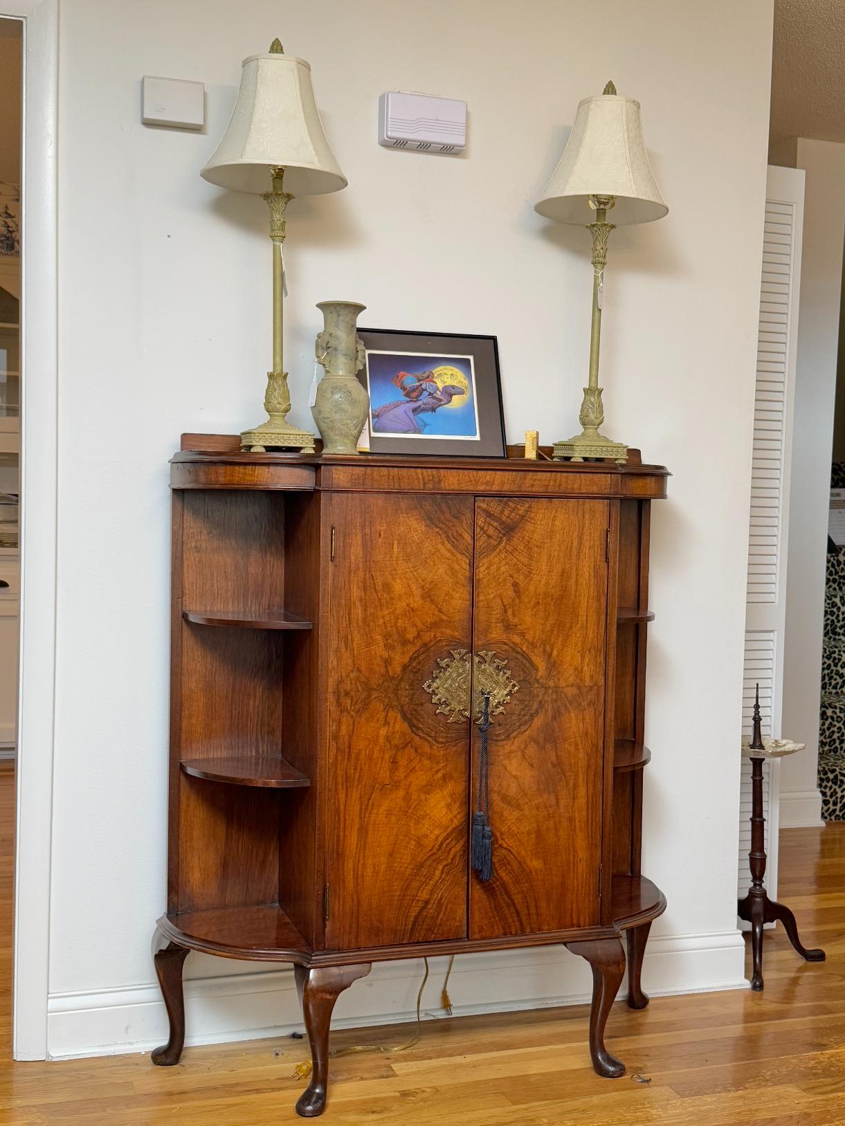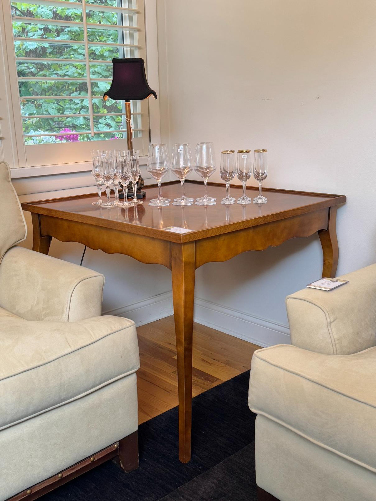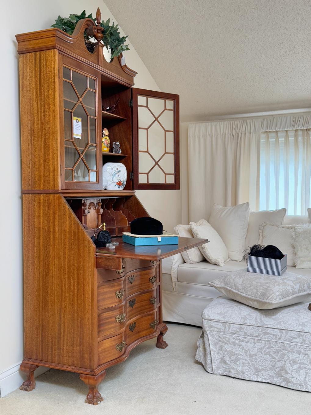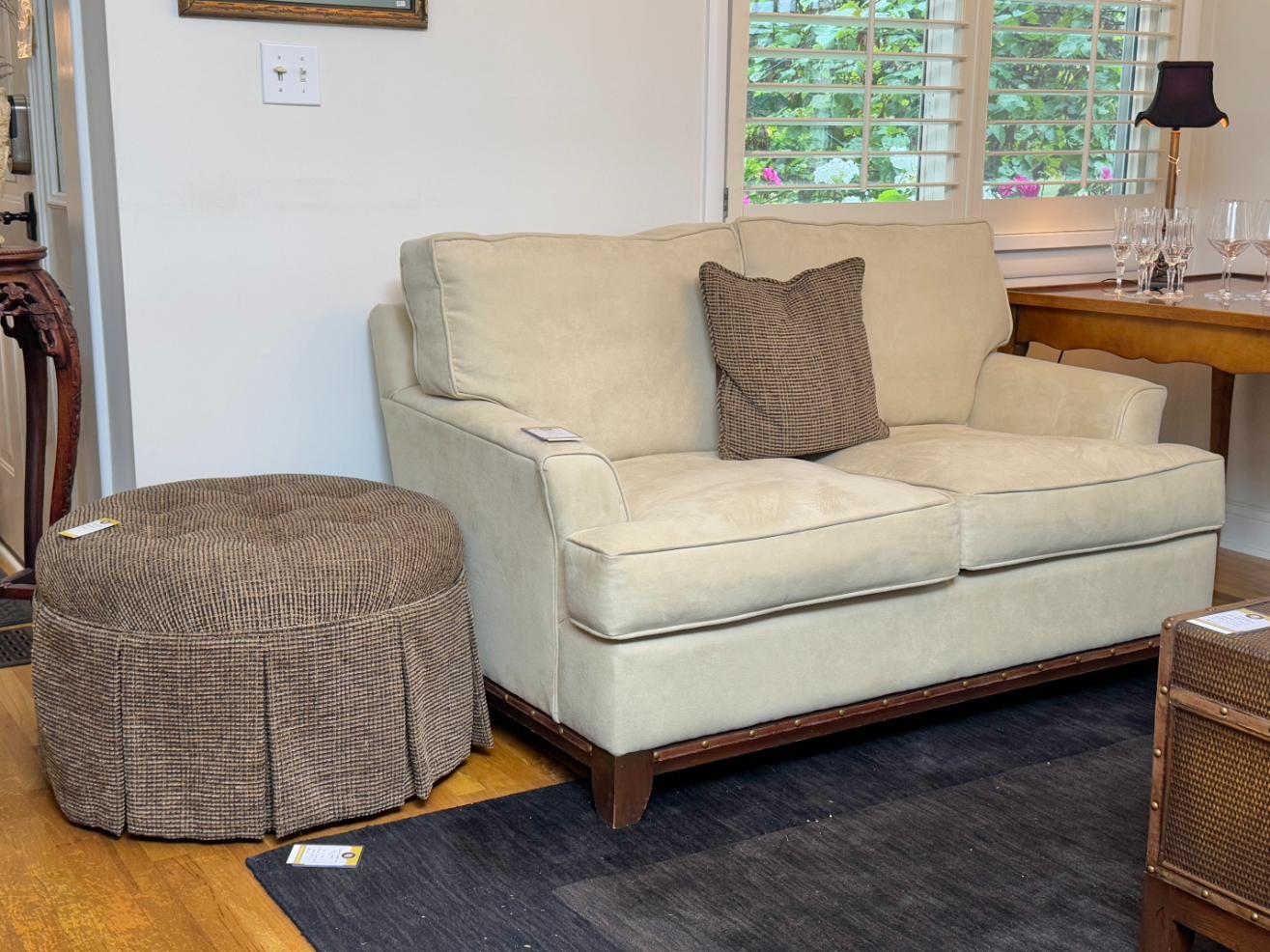 Oval Glads Top Dining Table with Dual Swan Pedestals, Braxton Culler Furniture Cream Upholstered Loveseat, Vintage Secretary Desk with Glass Display Hutch, Set of Six Frederick Massoud Slipper Chairs, The Morgantown Collection Serpentine Front Sideboard, Old Hickory Tannery Lounge Chair with Ottoman, French Style Accent Table with Parquetry Top, White Roll Arm Three Seat Sofa with Pillow, Antique Burl Wood Cocktail Cabinet with Cabriole Legs, LA-Z-Boy Oxblood Recliner Chair, Cream Fauteuil Armchair in Jungle Print Upholstery, Custom Upholstered Brown Skirted Loveseat, Vintage Set of Four French Country Rush Seat Dining Chairs, Kitchen Cabinet with Stone Worktop