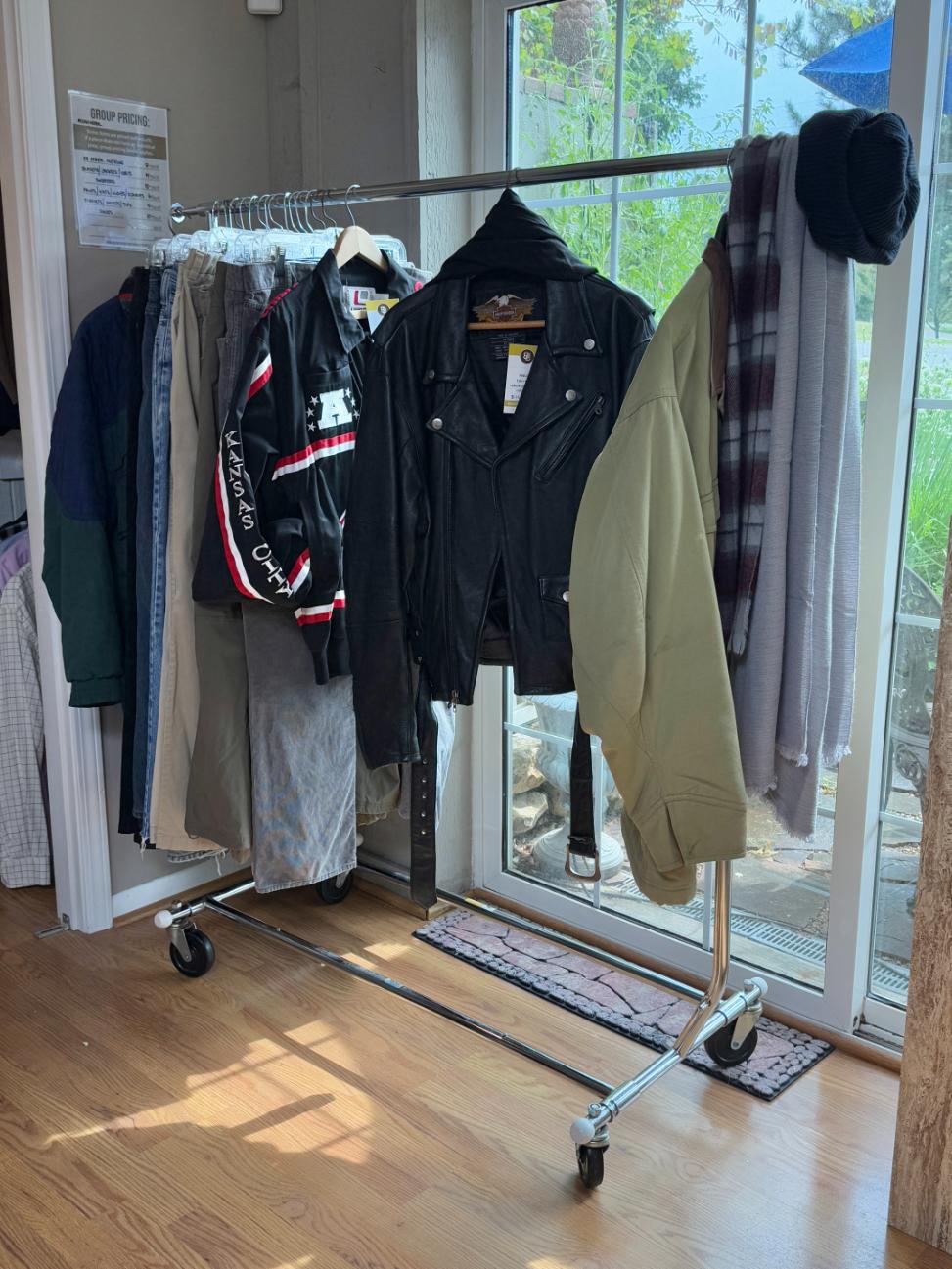 Item highlights include: Christian Dior Purple Robe and Nightgown with Lace Trim, Christian Dior Black Velvet Blazer, Women’s Nelson Leather Company Fringe Jacket, Men’s Harley-Davidson Moto Jacket