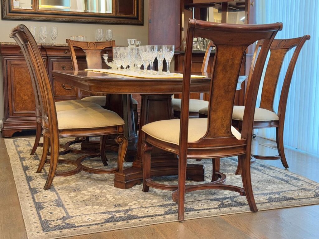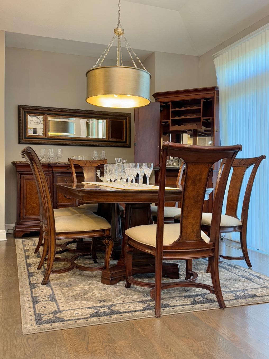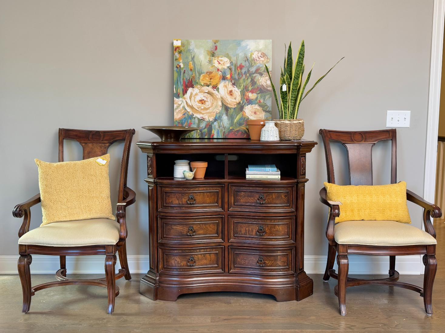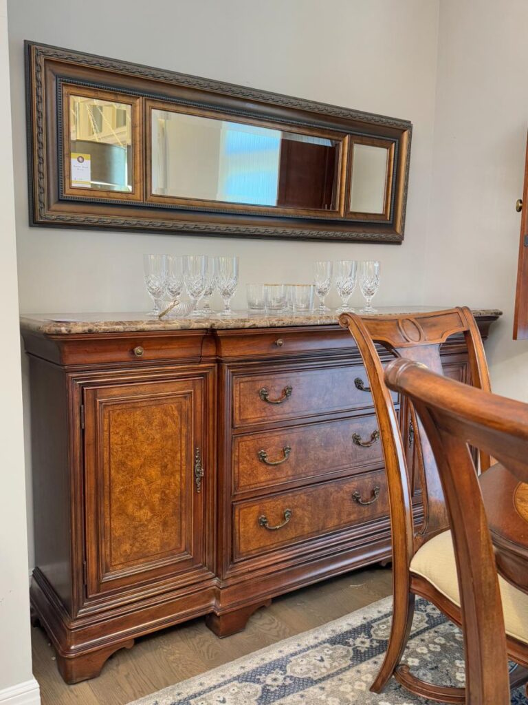 Howard Miller Lighted Bar Cabinet with Drop Down Tray, Havertys Van Buren Mahogany Wall Entertainment Center, Thomasville Stone Top Credenza with Burl Wood Accents, Thomasville ‘Deschanel’ Dining Chairs, Thomasville Double Pedestal Extension Dining Table with Burl Wood Top, Vintage Oak Vanity Dresser with Four Drawers, Vanity Dresser with Twelve Drawers, Pier 1 Imports Gray Upholstered Sofa, Metal Scrollwork Twin Daybed with Trundle, Honey Oak Buffet Hutch, Coaster Fine Furniture Round Wood Pedestal Game Table, Chest of Six Drawers, Ashley Furniture Wood and Iron Detail Sofa Table, Vintage Oak Tall Dresser with Five Drawers, Painted Console with Seven Drawers, Light Blue Corner Cabinet, Full-Size Panel Detail Sleighbed with Mattress and Box Spring, Black Wooden Barrister Style Three-Tier Bookcase, Set of Three Tufted Counter Stools, Vintage Oak Full-Size Bed Frame including Mattress and Box Spring, Set of Four Faux Leather Cushioned Chairs on Castors with Hobnail Trim, Reproduction Vanity with Mirror and Stool
