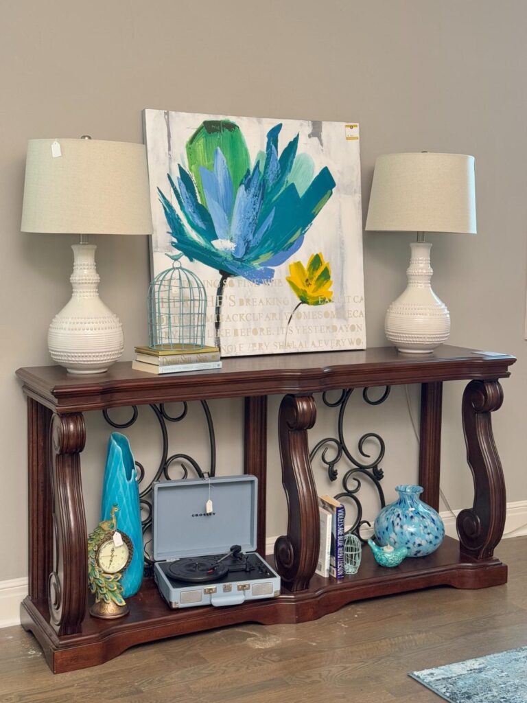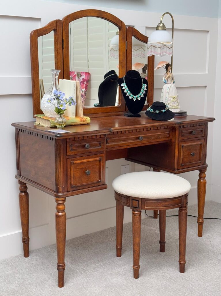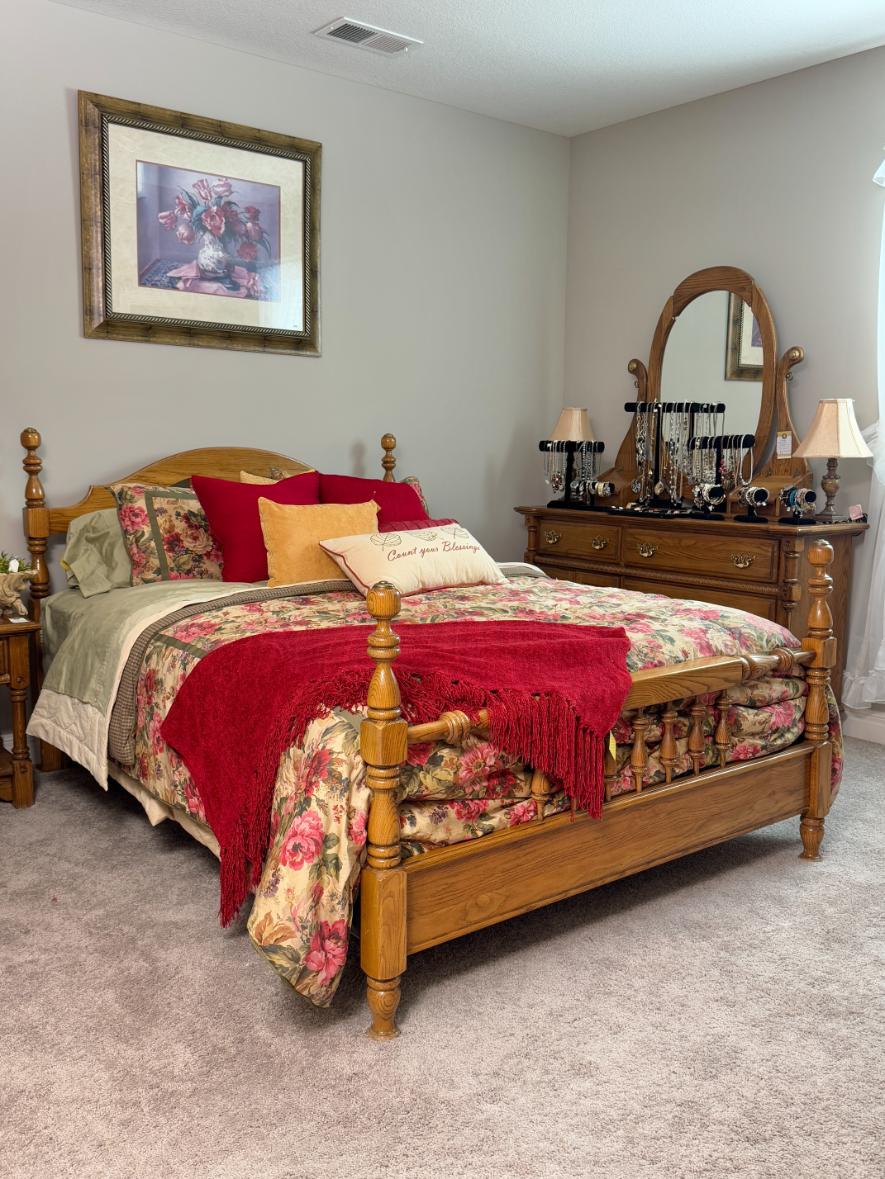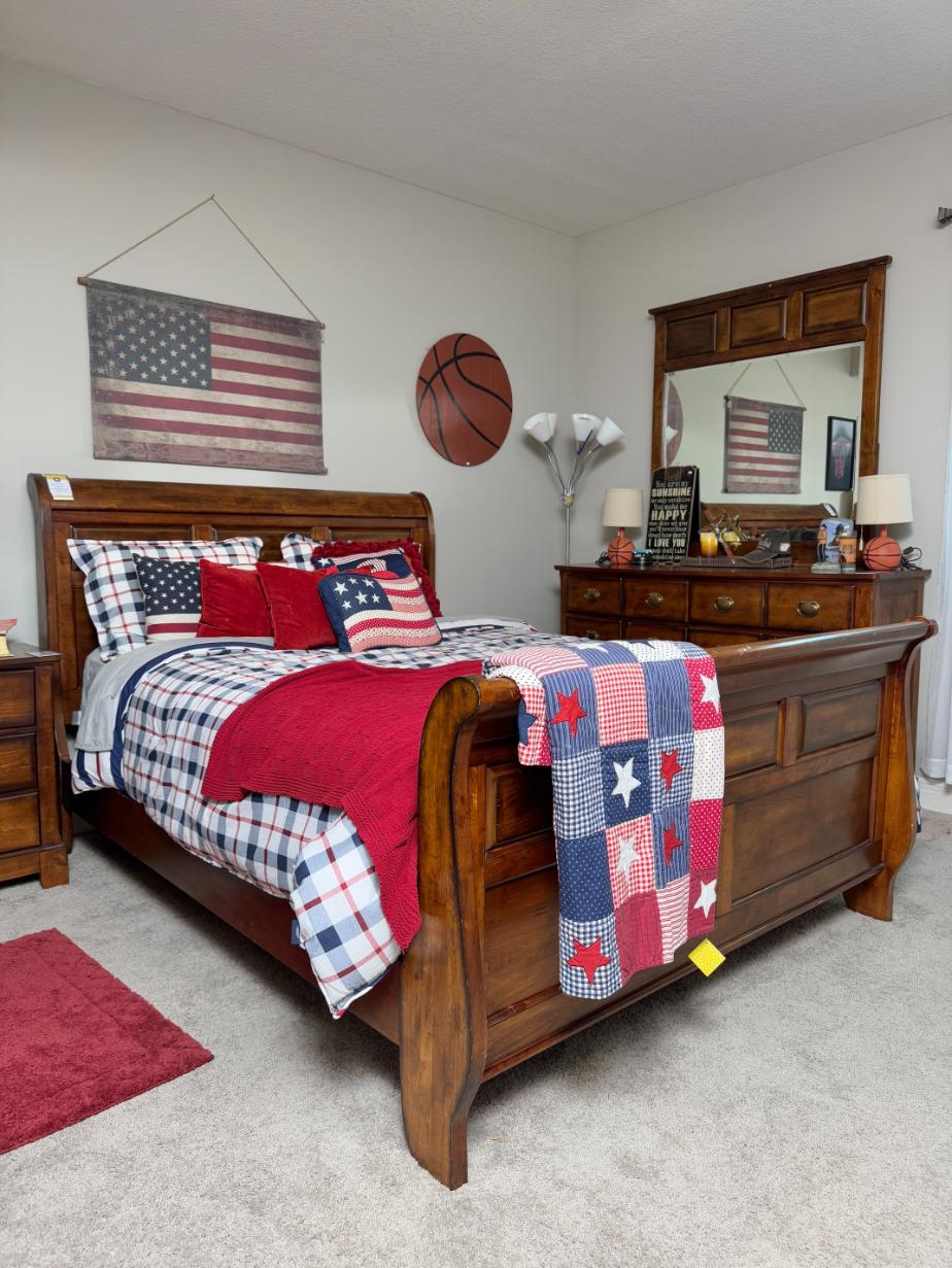 Howard Miller Lighted Bar Cabinet with Drop Down Tray, Havertys Van Buren Mahogany Wall Entertainment Center, Thomasville Stone Top Credenza with Burl Wood Accents, Thomasville ‘Deschanel’ Dining Chairs, Thomasville Double Pedestal Extension Dining Table with Burl Wood Top, Vintage Oak Vanity Dresser with Four Drawers, Vanity Dresser with Twelve Drawers, Pier 1 Imports Gray Upholstered Sofa, Metal Scrollwork Twin Daybed with Trundle, Honey Oak Buffet Hutch, Coaster Fine Furniture Round Wood Pedestal Game Table, Chest of Six Drawers, Ashley Furniture Wood and Iron Detail Sofa Table, Vintage Oak Tall Dresser with Five Drawers, Painted Console with Seven Drawers, Light Blue Corner Cabinet, Full-Size Panel Detail Sleighbed with Mattress and Box Spring, Black Wooden Barrister Style Three-Tier Bookcase, Set of Three Tufted Counter Stools, Vintage Oak Full-Size Bed Frame including Mattress and Box Spring, Set of Four Faux Leather Cushioned Chairs on Castors with Hobnail Trim, Reproduction Vanity with Mirror and Stool