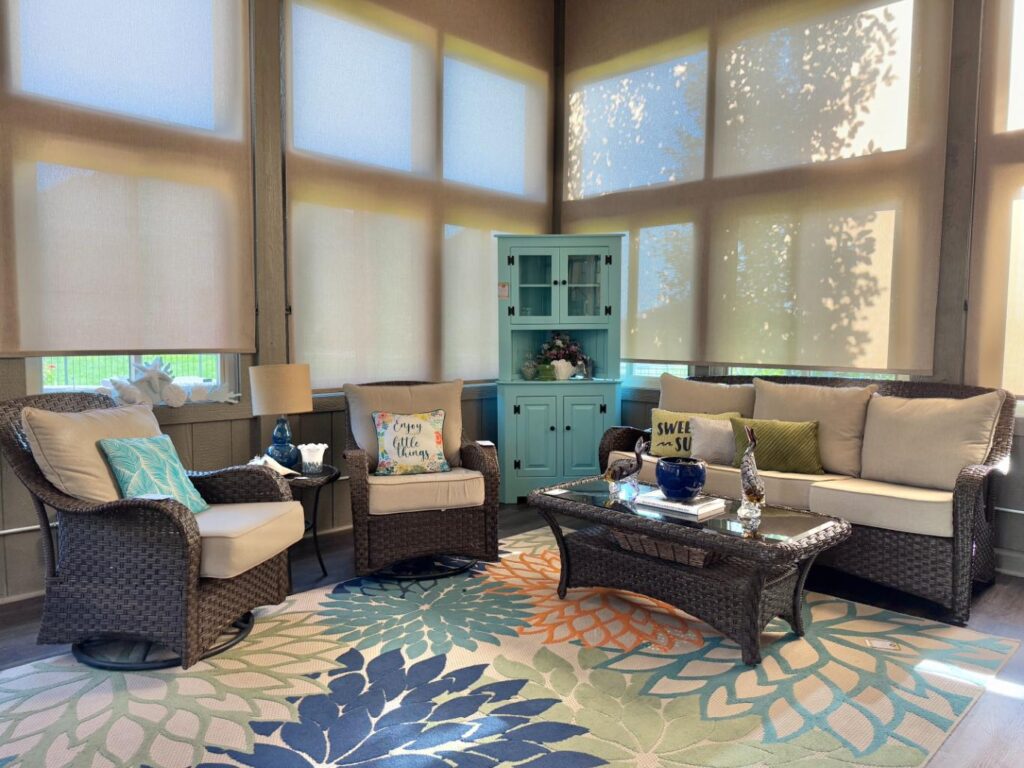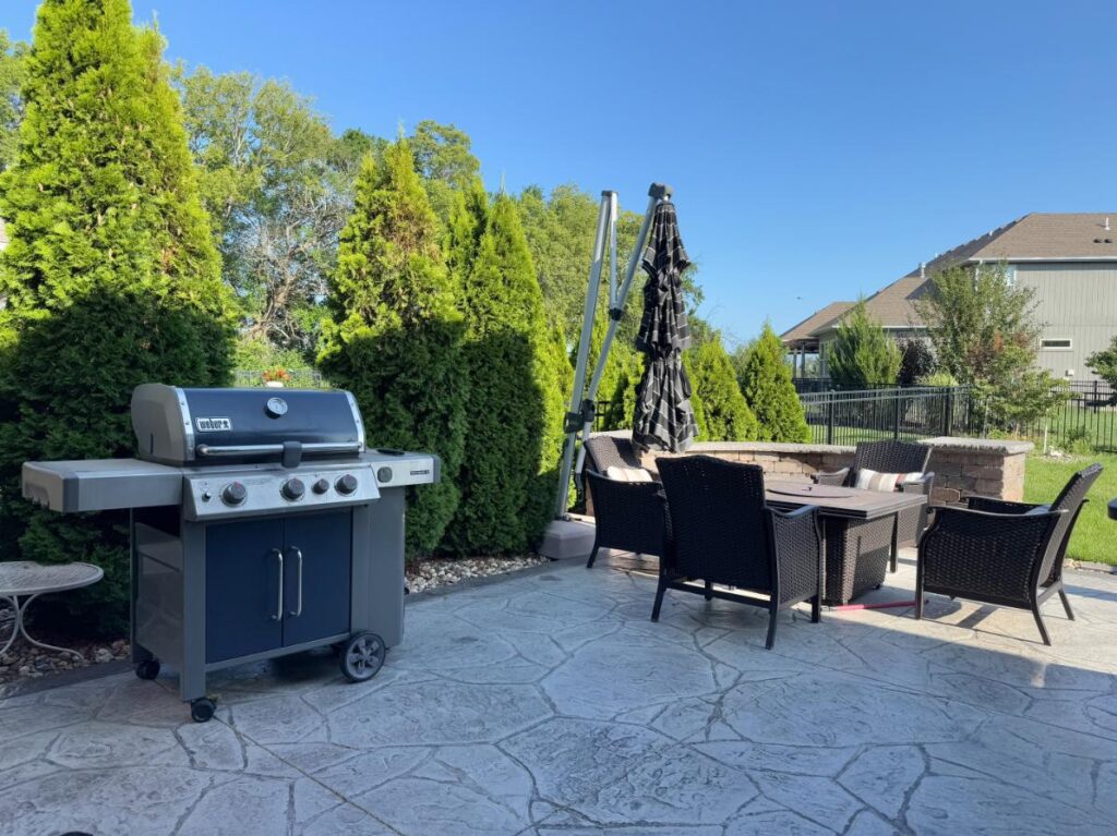 Seaside Casual Resin Patio Table with Two Benches and Umbrella, Four Patio Chairs with Firepit Table, Resin Wicker Patio Sofa, Patio Cantilever Umbrella, Weber GS4 Grill with Cover, Resin Wicker Patio Swivel Armchairs, Vintage Tile Top Patio Bar Cart, Brown Wicker Armchairs with Pull-Out Ottoman